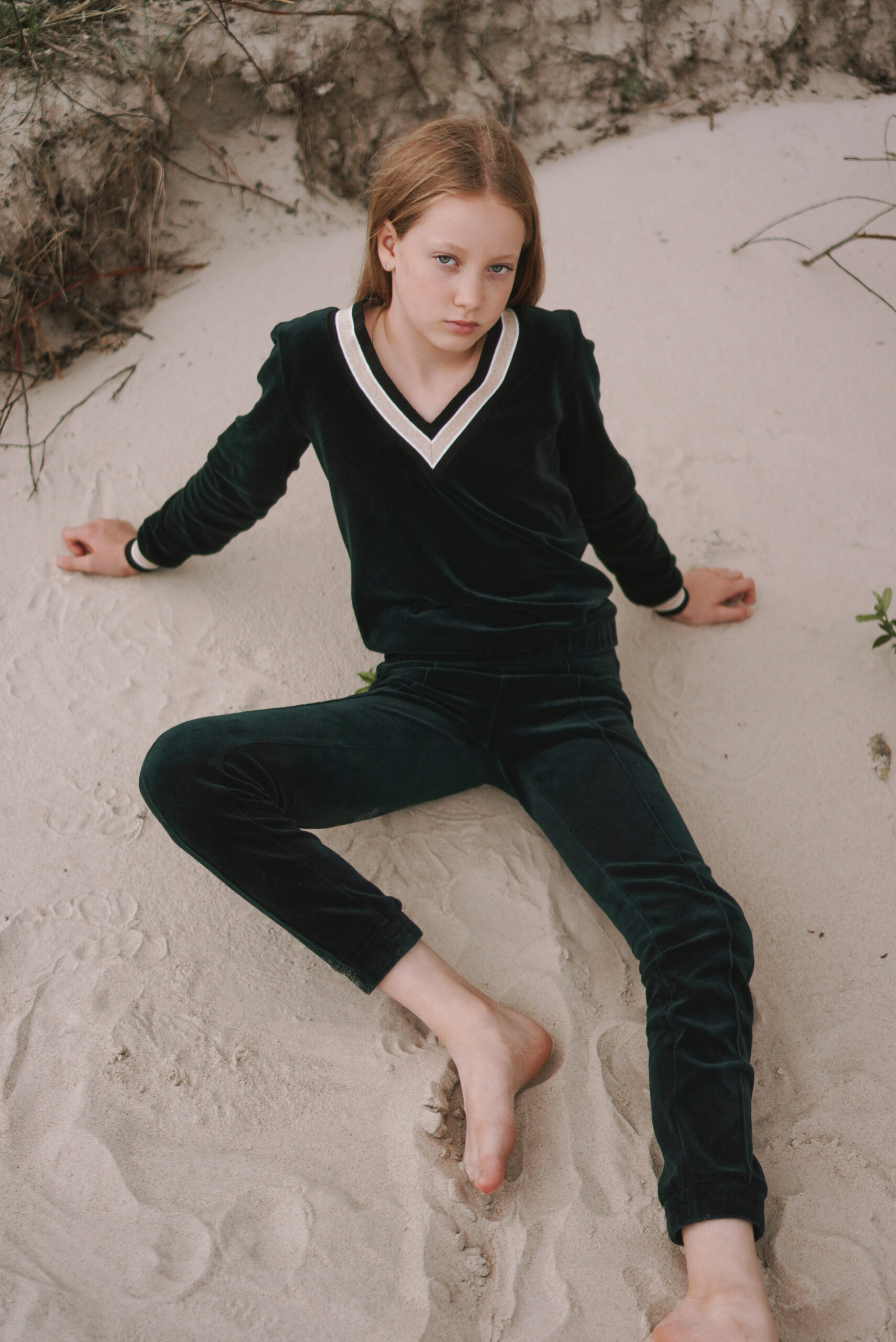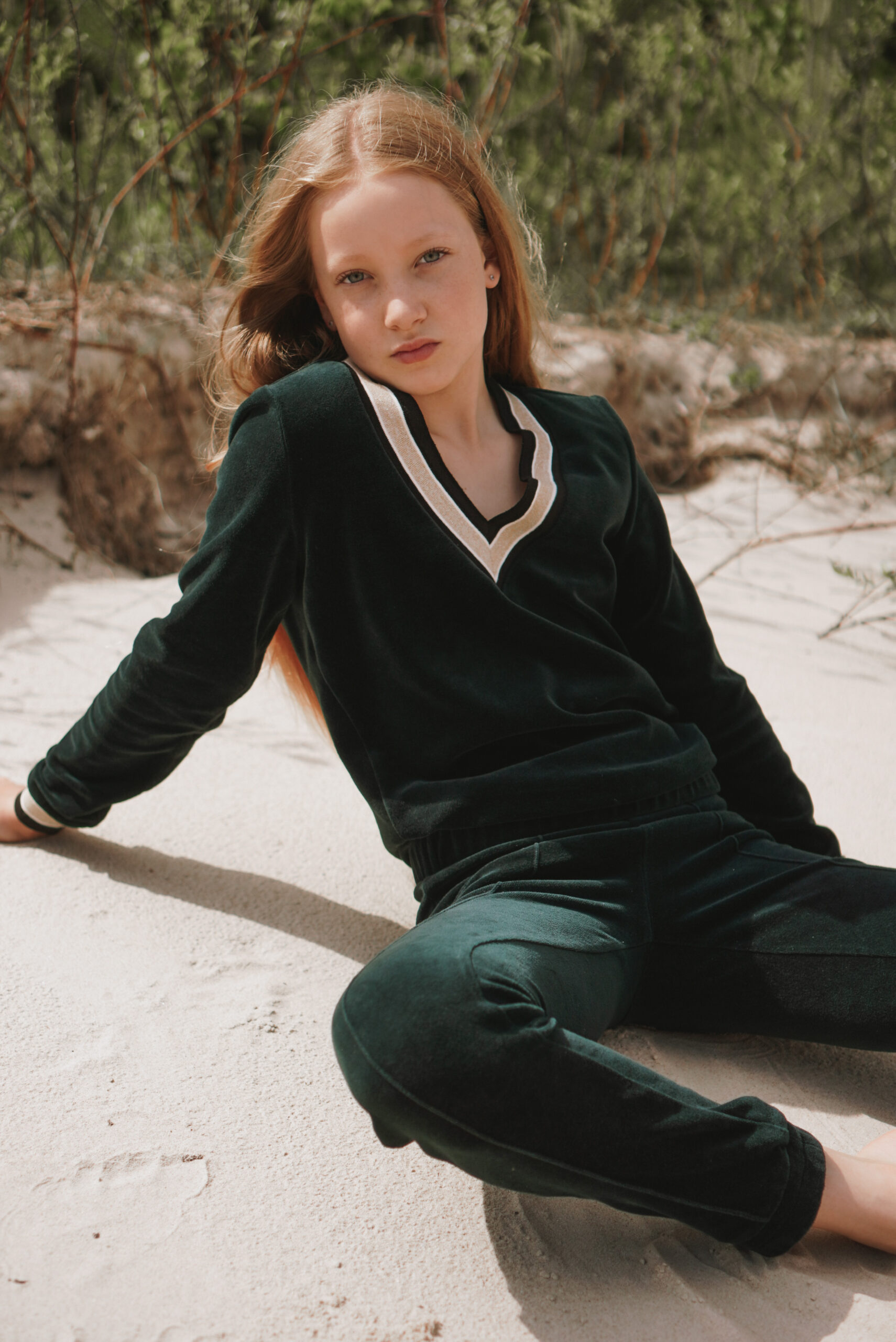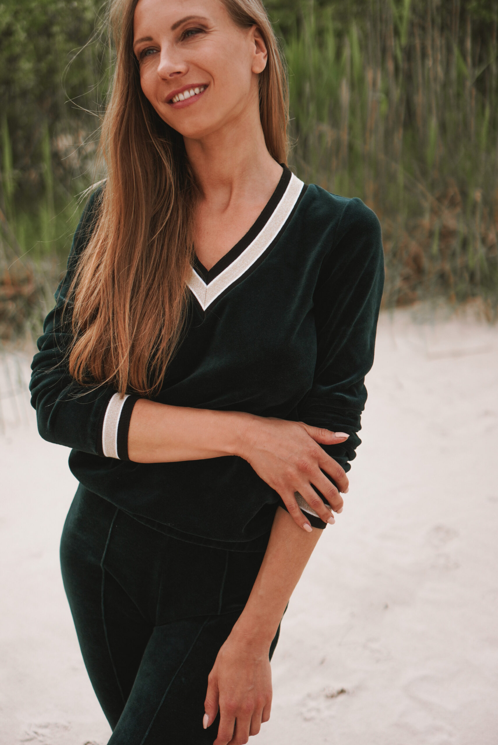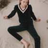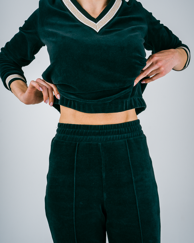 Šis elegantais un izsmalcinātais atpūtas apģērbu komplekts ir izgatavots no viegli kopjama kokvilnas samta. Tā dizains ir rūpīgi izstrādāts, lai tajā justos īpaši ērti un komforti. Komplektā ietilpst džemperis ar dekoratīvām, elastīgām manžetēm un bikses ar iestrādātām buktēm staru priekšpusē un mugurpusē. Šis samta kostīms būs īpaši piemērota izvēle, ja vēlies nedaudz siltuma un vienlaicīgi justies ērti un brīvi.